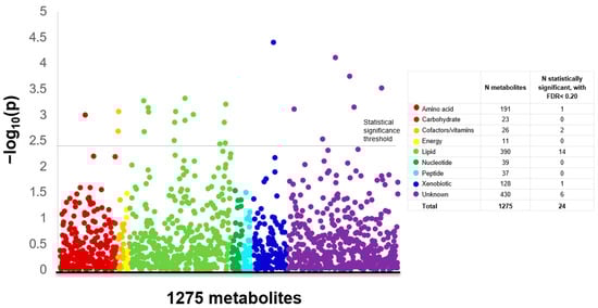Triplicates of 46 samples and duplicates of five samples were used as quality controls to assess the reproducibility of the platform. Across the 1275 metabolites, the median intraclass correlation coefficient (ICC) was 0.93 (25th and 75th percentile, respectively: 0.83, 0.98), indicating a high level of technical reliability comparable to that observed in previous analyses [13,28]. The median within-batch coefficient of variation was 0.13 and the median between-batch coefficient of variation was 0.18.
