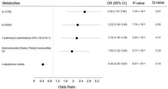 Odds ratios, 95% confidence intervals, p-values, and Q-values among non-hormone users at baseline for postmenopausal breast cancer when comparing the 90th with the 10th percentile levels of metabolites (n = 319 cases). Results were from unconditional logistic models adjusted for age at blood draw and are presented only for metabolites below the false discovery rate threshold of 0.20. Markers indicate the odds ratio, and error bars, the 95% confidence intervals. The Q-value is the estimated probability of a false discovery.
