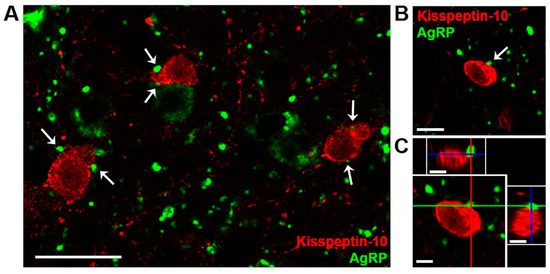 Confocal images (1.0 µm optical section; 40 × magnification) showing dual-label immunofluorescence for AgRP (green) and kisspeptin (red) in the arcuate nucleus of a castrated male sheep (wether). White arrows (A,B) indicate examples of AgRP-immunoreactive (ir) terminals in apposition to arcuate kisspeptin neurons, with AgRP-ir cell bodies and fibers seen in the vicinity. Orthogonal views (C) confirm close contact of an AgRP-labeled bouton to a kisspeptin cell body. Red, green, and blue lines in (C) indicate X, Y, and Z planes, respectively. Scale bars = 25 µm (A), 10 µm (B,C).