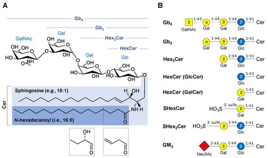 Overview of chemical structures of the neutral and acidic glycosphingolipid (GSL) subclasses studied in this work: (A) General structure of neutral GSL depicting individual parts of the complex molecule with possible modifications of N-linked fatty acyl chain (dashed boxes). (B) Basic structures of GSL subclasses using the established glycan symbols (the letter and the number within symbols define the nature of the glycosidic linkage). Abbreviations used in the figure are as follows: ceramides (Cer), N-acetylneuraminic acid (Neu5Ac), galactose (Gal), glucose (Glc), N-acetylgalactosamine (GalNAc), globotetraosylceramides (Gb4), globotriaosylceramides (Gb3), dihexosylceramide (Hex2Cer), monohexosylceramide (HexCer)—glucosylceramide (GlcCer) or galactosylceramide (GalCer), monohexosylsulfatide (SHexCer), dihexosylsulfatide (SHex2Cer), monosialodihexosylganglioside (GM3).