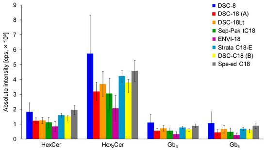 In total, seven C18-based and one C8-based SPE cartridges from different vendors, including the Sep-Pak tC18 cartridge, were compared and examined in more detail. SPE cartridges contained the same amount of sorbent (500 mg; except for 200 mg in case of Sep-Pak tC18). The SPE procedure was performed using the same extraction protocol (see Materials and Methods). Three replicates, each with three consecutive injections, were used for all types of C18-based SPE cartridges (Figure 2). Previously used tC18 Sep-Pak cartridge for gangliosides did not prove to be the best option for the isolation of neutral GSL, probably caused by smaller amount of sorbent in comparison to other cartridges. The highest intensities for all investigated neutral GSL subclasses are achieved with the DSC-C8 cartridges. However, error bars indicate a high variability in obtained results, which is unsatisfactory. The optimal results with satisfactory error bars for all investigated neutral GSL subclasses are realized with Spe-ed C18/18 SPE cartridges, which were selected for the next experiments.