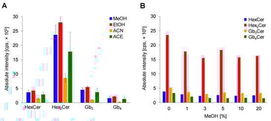 Optimization of sample preparation. (A) Comparison of solvents methanol (MeOH), ethanol (EtOH), acetonitrile (ACN) and acetone (ACE) for plasma deproteinization. Bar graphs display means of absolute peak intensities of the most abundant species within particular GSL subclass, and error bars illustrate standard deviations within nine analyses. (B) Effect of MeOH % abundance in loading step.