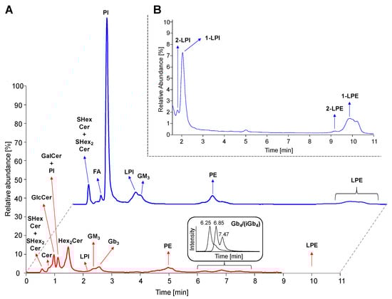 Hydrophilic interaction liquid chromatography coupled to electrospray ionization mass spectrometry (HILIC-ESI/MS) chromatograms. (A) Reconstructed ion current (RIC) chromatograms of detected lipid subclasses (m/z 50–1500) in human plasma using both positive (bottom red line) and negative (upper blue line) polarity modes. (B) Chromatogram illustrating separation of sn-1 (i.e., 1-LPI and 1-LPE) and sn-2 (i.e., 2-LPI and 2-LPE) regioisomers of lysophospholipids. Abbreviations: (lyso)phosphatidylinositols, (L)PI; (lyso)phosphatidylethanolamines, (L)PE; isoglobotetraosylceramides (iGb4), and fatty acids (FA).