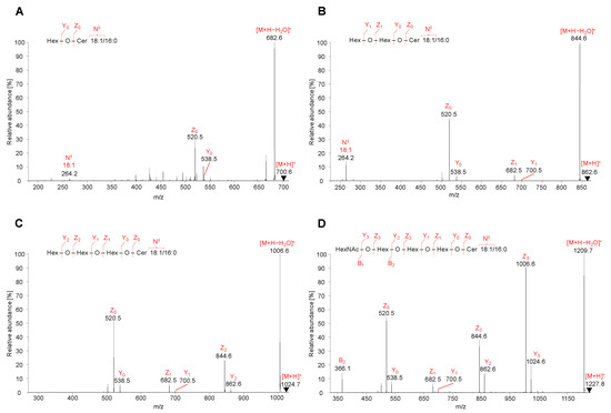 MS/MS spectra of HexCer, 18:1/16:0, Hex2Cer, 18:1/16:0, Gb3, 18:1/16:0, and Gb4, 18:1/16:0 were characterized by the fragmentation of precursor ions [M+H]+ identified as m/z 700.6 for HexCer (Figure 5A), m/z 862.6 for Hex2Cer (Figure 5B), m/z 1024.7 for Gb3 (Figure 5C), and m/z 1227.8 for Gb4 (Figure 5D). All observed fragment ions are singly charged.