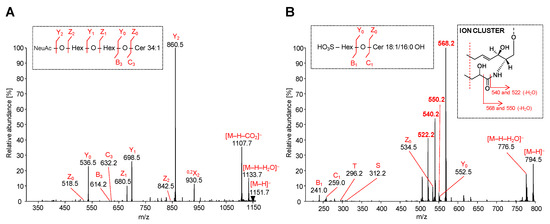 HILIC-ESI-MS/MS spectra of representative acidic GSL species: MS/MS spectra illustrate fragmentation pathways with specific product ions of (A) ganglioside GM3 34:1 at m/z 1151.7, and (B) sulfatide SHexCer 18:1/16:0 OH at m/z 794.5.