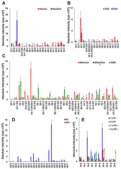 Profile of human plasma lipids. (A) mono- and dihexosylceramides, (B) globotriaosyl- and globotetraosylceramides, (C) sulfatides and gangliosides, (D) phospholipids, and (E) lysophospholipids. The individual lipid species within particular lipid subclass were identified and structurally characterized by the interpretation of MS/MS spectra (see Figure 5, Figure 6 and Figures S4–S131). Bar graphs represent the mean intensities (based on 3 replicates) as a function of sum composition with error bars corresponding to relative standard deviation (RSD). Lipid species labeled by an asterisk were not confirmed by MS/MS experiments.