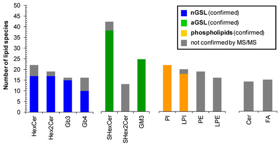 Number of lipid species identified within particular lipid subclass. Colored bars represent the number of lipid species identified and structurally characterized by MS/MS experiments. Grey bars correspond to identified lipid species that were not confirmed by MS/MS experiments. Abbreviations: neutral glycosphingolipids (nGSL) and acidic glycosphingolipids (aGSL).