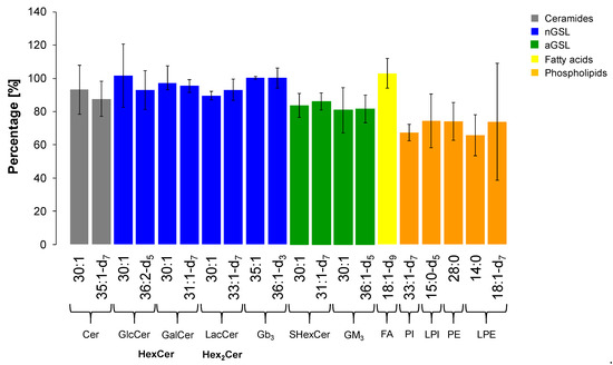 The extraction recovery was assessed by the comparison of absolute intensities of ISs in plasma samples spiked with 25 µL of IS Mix before and after the extraction in triplicates. We used one or two internal standard for each lipid subclass as shown in Table 3. The results expressed as mean ± RSD (Relative Standard Deviation) are illustrated in Figure 10. Evaluating the outcomes, we conclude that our extraction method is sufficiently efficient in extraction of GSL, which is proven by reproducible responses for all deuterated IS for particular GSL subclasses and ceramides (i.e., RSD from 4.0 to 12.5%). In addition, most of non-deuterated IS of GSL used as second IS also met the requirement (i.e., RSD ≤ 15%) [60,61], except for GlcCer (RSD 18.8%), GM3 (RSD 17.0%), and Cer (RSD 15.8%), where the RSD values were slightly higher. On the other hand, the extraction of phospholipids is slightly less effective than for GSL with a greater variability in the reproducibility (i.e., RSD from 7.5 to 21.8%), notably LPE subclass (RSD 47.8%).