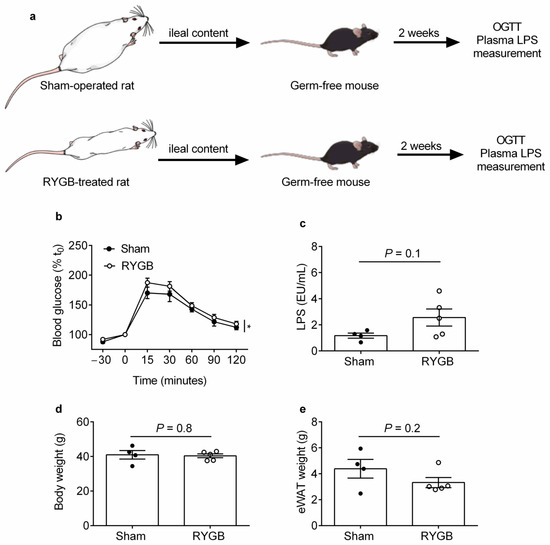 Ileal Content Transfer from RYGB-Treated Rats to Germ-Free Mice Modestly Impairs Oral Glucose Tolerance and Heightens Systemic Endotoxemia Development (a) Schematic diagram illustrating the ileal content transfer experiment performed on germ-free mice. (b) Percentage (%) change in tail vein blood glucose concentrations relative to t = 0 min (t0) during the oral glucose tolerance test of germ-free mice that had received ileal content from RYGB-treated and sham-operated rats. (c) Plasma LPS concentrations, (d) body weight and (e) epididymal white adipose tissue (eWAT) weight from the mice in (b). n = 4–5 mice/group. Data are presented as mean ± SEM. Statistical significance was determined by two-way ANOVA (main effect of treatment) in (b) and two-tailed, unpaired t-test in (c–e). * p < 0.05.