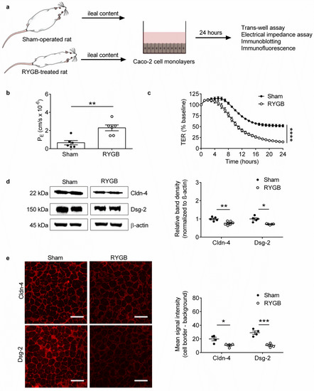 The IEB serves as a gateway against translocation of pathogenic microbes and toxins from the intestinal lumen to the body [7]. To gain an indication if RYGB-associated ileal microbiota produce and release soluble metabolites which locally disrupt the IEB, we performed functional and structural experiments on Caco-2 cells, a human colonic cancer cell line differentiated into polarized enterocytes, with the same ileal content used on germ-free mice (Figure 2a).