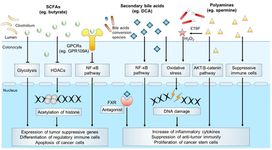 Secondary bile acids, especially DCA, are considered significant contributors to the development of CRC. DCA was first shown to be a carcinogen that promotes CRC development in mice in 1940 [79]. In a recent study, administration of DCA induced colonic tumor formation particularly in the context of obesity [80], as high-fat diet induced alterations in the gut microbiota contributed to increased intestinal DCA levels. Hydrophobic DCA exerts multiple pathogenic effects on the colon epithelium including the disruption of cell membrane, induction of oxidative damage to DNA, and activation of NF-κB to provoke inflammation. A study reports that DCA disrupted cell monolayer integrity and increased pro-inflammatory cytokine production in the intestine, leading to low grade inflammation and aggravation of intestinal tumorigenesis in ApcMin/+ mice [81]. In vitro experiments showed that DCA exposure induced single-strand breaks of DNA in CRC cells [82]. DCA-induced mitochondrial oxidative stress can activate NF-κB signaling in CRC cells, leading to decreased apoptosis and tumor progression [83]. Furthermore, bile acids could interact with bile acid receptors to promote CRC. DCA antagonizes intestinal farnesoid X receptor (FXR) function, which in turn, induces cell proliferation and Lgr5+ cancer stem cell expansion [84]. Collectively, DCA is a key secondary bile acid implicated in the promotion of colorectal tumorigenesis.