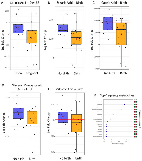 Boxplots of metabolite biomarkers of embryonic viability measured in embryo culture medium of embryos that led to pregnancy or non-pregnancy: Stearic Acid on pregnancy Day-62 (A; ROC-AUC = 0.733 [0.570–0.898]), and Stearic acid at birth (B; ROC-AUC = 0.743 [0.437–0.838]), Capric Acid at birth (C; ROC-AUC = 0.728 [0.465–0.840]), Glyceryl Monostearate at birth (D; ROC-AUC = 0.670 [0.570–0.898]), and Palmitic Acid at birth (E; ROC-AUC = 0.669 [0.533–0.870]). Black dots represent the concentrations of all samples of each metabolite scaled as Log Fold Change values. The notch indicates the 95% confidence interval around the median. The mean concentration of each group is shown by a red diamond. The optimal cut-off is indicated as a horizontal red line (i.e., the closest to the left-hand corner in the corresponding ROC-AUC). (F) represents the above and other top metabolites (Y axis) ranked by their contribution to classification accuracy in predicting birth expressed as frequency (X axis) (Random Forests multivariate classification algorithm).