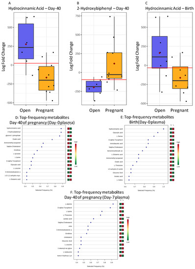 In Day-7 plasma, alanine and lysine differed within pregnancies diagnosed at birth, while threonine differed on Day-62. Such metabolites were confirmed as candidate biomarkers with ROC-AUC > 0.778 and either significant (p < 0.05) or close to significant (p < 0.07) values. Boxplots of the most relevant plasma Holstein biomarkers from Day-0 plasma are shown in Figure 2A–C and frequency rankings by the Support Vector Machine (SVM) for Day-0 candidate biomarkers at gestational Day-40 and birth, and on Day-7 at birth, are shown in Figure 2D–F.