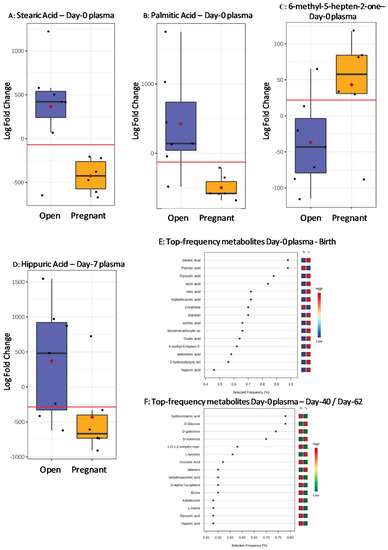 In Day-0 plasma, 6-methyl-5-hepten-2-one, stearic acid, and palmitic acid (at birth). Palmitic acid (at Day-62 and Day-40, same results) differed (p < 0.05) or tended to differ (0.05 < p < 0.072) (Table 3) between diagnosed open and pregnant AV recipients. In Day-7 plasma, hippuric acid differed in pregnancies diagnosed at birth, and hippuric acid, valine, N-(2-hydroxyethyl) iminodiacetic acid 2 (abbreviated as HEIDA), and dehydroascorbic acid differed in pregnancy diagnoses at Day-62 and Day-40. These metabolites were candidate biomarkers with ROC-AUC > 0.832 and significant (p < 0.05) or close to significant (p < 0.072) values.