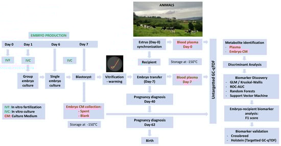 In this work, recipient variability was ensured with cattle from different breeds (Holstein and AV) and batches of different animals used in a three-year period (discovery study) and a subsequent two-year period (validation study). No special conditions were required other than testing free of the most prevalent (N = 7) infectious diseases affecting reproduction with a potential incidence in the region, healthy after clinical examination and normal after gynecological examination. Variability in embryos was based on oocytes (blind ovary collection from abattoir) fertilized with different bulls (AV (N = 4), Holstein (N = 3)). The blood plasma of recipients was collected at fixed times on Day-0 and Day-7 (4–6 h before ET). After warming, all vitrified and thawed Day-7 embryos were transferred, and no embryo or ET was discarded by any condition not described here over the experimental course of five years (Discovery and Validation studies). Pregnancy was monitored on days 40, 62, and birth. Metabolomic analysis of embryo CM and plasma was conducted as shown above to obtain relative (discovery study and part of validation study) or absolute (validation study) metabolite concentrations.