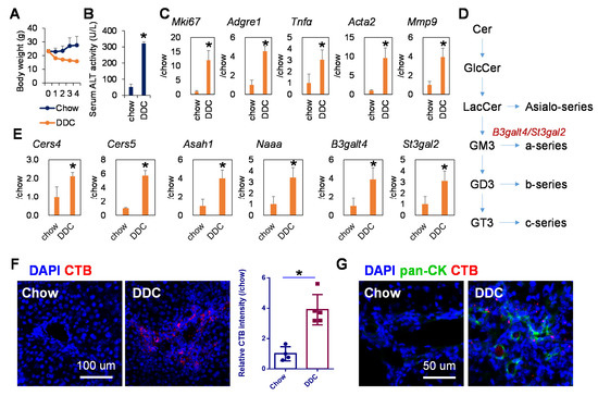 Mice fed with 0.1% DDC-containing diet for 4 weeks demonstrated dramatic body weight loss (Figure 1A) and elevated serum alanine transaminase (ALT) activity (Figure 1B), the most common and best-established indicator of hepatocyte cell death [23]. In line with this, expression levels of genes related to compensatory cell proliferation (Mki67), inflammation (Adgre1 and Tnfa), and fibrosis (Acta2, coding αSMA) and Mmp9 were strongly increased in the livers of DDC-fed mice in comparison with those in chow-fed mice (Figure 1C). Next, the gene expression of enzymes involved in ganglioside synthesis was examined using PCR (Figure 1D). As shown in Figure 1E, the expression of ceramide synthases (Cers4 and Cers5), acid ceramidase (Asah1), N-acylethanolamine acid amidase (Naaa), and beta-1,3-galactosyltransferase (4B3galt4) and β-galactoside α-2,3-sialyltransferase 2 (St3gal2), two key enzymes involved in the synthesis of GM1 ganglioside [24,25], was significantly upregulated in the livers of DDC-fed mice. In contrast, no obvious change or significant decrease in the gene expression of Cers1 and Cers2, two enzymes that catalyze the synthesis of very long chain ceramides, were observed in the livers of DDC-fed mice, respectively (Figure S1). Cers3 was not detected in mouse livers. To further explore the changes of ganglioside synthesis in the liver of DDC-fed mice, the levers of GM1 ganglioside in murine livers were measured by immunofluorescence staining with cholera toxin subunit B (CTB), which is a heat-labile enterotoxin and has been widely used as a molecular probe to detect binding to ganglioside GM1 due to its high binding affinity [26]. In accordance with the results of gene expression analysis, the level of CTB-defined ganglioside GM1 was dramatically increased in the livers of DDC-fed mice, especially in the portal vein region (Figure 1F). Furthermore, co-immunofluorescence staining demonstrated that the enhanced GM1 ganglioside was mainly observed in the region positive for pan-cytokeratin (pan-CK), which is a duct-specific marker used to define the ductal epithelium-like bi-potent characteristics of liver progenitor-like cells [27]. As a proof of concept, direct profiling of tissue lipids using matrix-assisted laser desorption and ionization time-of-flight mass spectrometry (MALDI-TOFMS) demonstrated that the contents of ceramide (d18:0/16:0, 504.513 m/z), GM1 ganglioside (18:1/18:0, 797.746 m/z), and glucosylceramides (d18:1/25:0, 848.765 m/z; d18:1/26:1, 870.741 m/z) were increased in the livers of DDC-fed mice than those in chow-fed mice (Figure S2). These data suggested that the increased ganglioside synthesis in DDC-induced liver injury was related to the progenitor response, which is critical for liver tumorigenesis [28]. Data mining of our previous human HCC transcriptome dataset [29,30] showed that the gene expression of CERS2, CERS4, CERS5, and CERS6 was significantly increased in HCC tumors compared with that in non-tumor adjacent tissues, while no obvious difference was observed in ASAH1 gene expression (Figure S3).