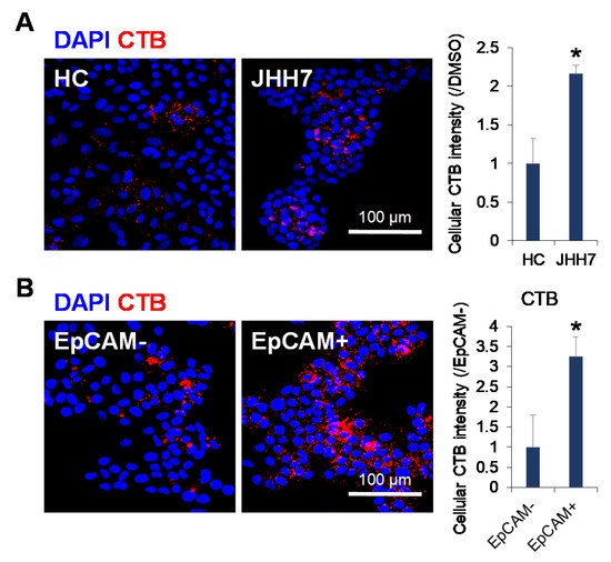 To further explore the relationship between ganglioside synthesis and liver cancer, the level of GM1 ganglioside was evaluated using CTB staining in normal hepatic cell HC and HCC cell JHH7. Notably, JHH7 cells showed significantly higher GM1 ganglioside levels than those in HC cells (Figure 2A). Next, the correlation between GM1 ganglioside and pan-CK-positive liver progenitor-like cells in the livers of DDC-fed mice led us to examine whether ganglioside synthesis is altered in liver CSC-like cells, which can be identified based on their differentiation stage using specific markers such as EpCAM [31]. We previously isolated EpCAM+ cells from heterogeneous JHH7 cells using fluorescence-activated cell sorting and showed that these cells had features of epithelial-like CSCs with increased expression of lipid metabolism-related enzymes [30,32]. Here, we provide direct evidence that CTB staining-defined GM1 ganglioside levels were significantly higher in EpCAM+ CSC-like JHH7 cells than those in EpCAM- non-CSC-like JHH7 cells (Figure 2B).