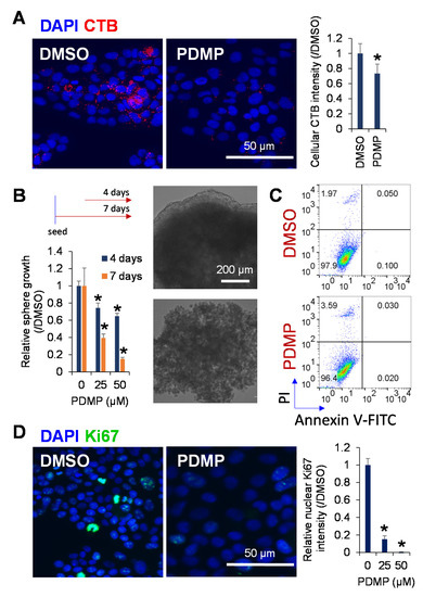 Next, we examined whether the inhibition of ganglioside synthesis using a chemical inhibitor PDMP might play a functional role in the proliferation of JHH7 cells in both monolayer and sphere cultures. According to CTB staining, PDMP treatment efficiently reduced GM1 ganglioside synthesis in JHH7 cells (Figure 3A). In a 3D culture system as a mimic of the tumor microenvironment enriched with CSC-like cells [33], PDMP treatment inhibited the spheroid proliferation of JHH7 cells in a dose- and time-dependent manner (Figure 3B). These data are in agreement with the above observations that ganglioside synthesis was increased in CSC-like JHH7 cells and support ganglioside as an important player in maintaining the sphere growth of HCC cells. Unexpectedly, flow cytometry analysis demonstrated that the proportion of Annexin V-positive apoptotic cells was not affected, while the proportion of propidium iodide (PI)-positive necrotic cells (1.97% and 3.59% in dimethyl sulfoxide (DMSO) and PDMP-treated cells, respectively) was only slightly increased by PDMP treatment in JHH7 cells in monolayer cultures (Figure 3C). In contrast, immunofluorescence staining showed that the percentage of cells expressing the cell proliferation marker Ki67 was almost completely suppressed in PDMP-treated JHH7 cells in monolayer cultures (Figure 3D). Collectively, these data indicate that ganglioside is critical in the control of cell proliferation and sphere growth of HCC cells, and inhibition of ganglioside synthesis suppressed cell cycle progression but did not induce cell death in HCC cells.