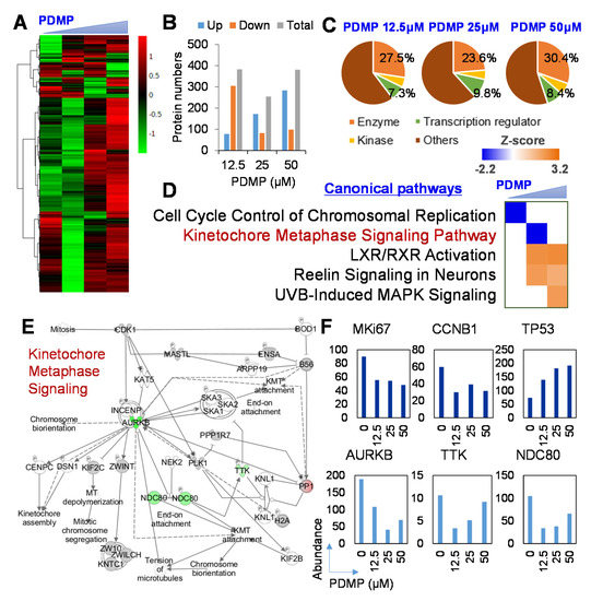 Next, to explore the molecular mechanism underlying the effects of ganglioside synthesis inhibition by PDMP on the proliferation of JHH7 cells, proteome analysis was performed to examine the global protein expression changes. A total of 4828 proteins were successfully detected in JHH7 cells using nLC-MS/MS analysis (Table S1). Hierarchical clustering demonstrated diverse protein expression profiles of JHH7 cells treated with PDMP at increasing concentrations (Figure 4A). PCA analysis of the protein expression profiles showed a similar distribution to that of the MALDI-TOFMS-based lipidome analysis (Figure S5). Proteins with a cut-off fold change of more than 2 in comparison to that of DMSO were selected for further analysis. The number of differentially expressed proteins at each concentration of PDMP treatment was comparable (Figure 4B). Furthermore, PDMP treatment at different concentrations showed similar functional annotations of differentially expressed proteins (Figure 4C). The highest percentage of differentially expressed transcriptional factors, approximately 9.8%, was observed with PDMP treatment at 25 μM. To further understand the biological process under the control of PDMP, the differentially expressed proteins were imported into the IPA program. An important statistical measure of IPA pathway analysis is the activation z-score, which can be used to identify likely regulating molecules based on a statistically significant pattern match of up- and down-regulation, and also to predict the activation state (either activated or inhibited) of a putative regulator [35]. Canonical pathway analysis of IPA showed that cell cycle progression-related signaling pathways, the “Cell Cycle Control of Chromosomal Replication” and the “Kinetochore Metaphase Signaling Pathway”, were functionally inhibited by PDMP treatment at 12.5 μM and 25 μM, respectively (Figure 4D). These concentrations also showed the most diverse lipid and protein profiles in comparison with that of the DMSO control (Figures S4 and S5). Detailed analysis of the schematic pathway of “Kinetochore Metaphase Signaling” indicated that three critical regulators of alignment and segregation of chromosomes during mitosis, aurora B kinase (AURKB), dual specificity protein kinase TTK (TTK, also referred to as Mps1), and kinetochore protein NDC80 homolog (NDC80) were under the control of PDMP in JHH7 cells (Figure 4E). Relative protein quantification by nLC-MS/MS analysis showed that the relative abundances of AURKB, TTK, and NDC80 were decreased by PDMP in JHH7 cells (Figure 4F). In line with this, the relative abundance of Ki67, a cell proliferation marker, and that of CCNB1, a regulatory protein involved in mitosis, were also decreased by PDMP in JHH7 cells (Figure 4F). In contrast, the relative abundance of TP53, a tumor suppressor protein that regulates the expression of target genes involved in cell cycle arrest and apoptosis in response to diverse cellular stresses, was increased by PDMP in JHH7 cells (Figure 4F).