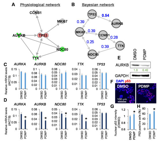 Finally, network analysis was applied to determine further the connection between the molecular targets of PDMP involved in kinetochore metaphase signaling and cell cycle regulators. The physiological network generated based on findings of previous studies using the Ingenuity Knowledge Base showed that TP53 played a central role in the inferred network (Figure 5A). In accordance with this, the Bayesian network showed that the node of TP53 was located at the top of the network hierarchy, and the strongest connection was observed between TP53 and AURKB (Figure 5B). The Bayesian network represents the joint posterior probability distribution over the whole set of variables in a system and is considered more biologically interpretable because of the removal of indirect correlations [36]. Intriguingly, upstream regulator analysis, the causal analytics algorithms in IPA, revealed that TP53 was the only upstream transcription regulator of AURKB, whose expression was regulated by PDMP in JHH7 cells (Figure S6). Finally, PCR analysis was performed to determine whether PDMP regulates kinetochore metaphase signaling at the transcriptional level. No obvious effect was observed in JHH7 cells treated with 25 μM PDMP for 4 h (Figure 5C). However, the gene expression levels of ARUKA, TTK, and NDC80 were significantly reduced in JHH7 cells treated with 25 μM PDMP for 24 h (Figure 5D). In line with this, the protein levels of AURKB were dramatically reduced in JHH7 cells treated with 25 μM PDMP for 24 h (Figure 5E). In contrast, no effect of PDMP treatment was observed on TP53 gene expression in JHH7 cells treated for either 4 h or 24 h (Figure 5C,D). Finally, we examined the nuclear accumulation of p53 protein, which is an important event of p53 activation in stressed cells [37]. Western blotting analysis of cellular fractions showed that the protein levels of nuclear p53 were slightly increased in JHH7 cells treated with 25 μM PDMP for 24 h (Figure S7). Similarly, immunofluorescence staining showed that both the protein levels of nuclear p53 and the percentage of p53-positive cells were slightly but significantly increased in JHH7 cells treated with 25 μM PDMP for 24 h (Figure 5F–H).