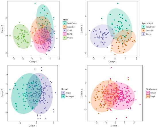 Visualization of the PLSDA model for a variety of model sets relevant to various carcass groups, reproduced from [28].