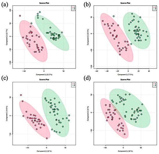 Female groups were also clearly separated in ionization mode. The score plots of PLS-DA in positive mode showed an accuracy of 97.7%, those of R2 showed an accuracy of 0.98, and those of Q2 showed an accuracy of 0.77 (Figure 1c). In negative mode, PLS-DA score plots showed an accuracy of 97%, those of R2 showed an accuracy of 0.96, and those of Q2 showed an accuracy of 0.78 (Figure 1d).