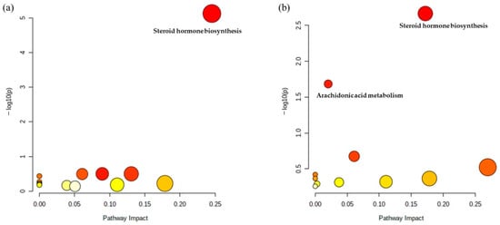 Differentiated metabolic pathways between patient groups and controls can be visually confirmed. Dark red indicates that the pathways were significantly different, with red circles indicating more significance than yellow circles. Light yellow means a less significant than yellow. The Y-axis represents the –log p values, whereas the X-axis represents the pathway impact values. (a) Pathway analysis based on 42 metabolites in male groups from an untargeted analysis and (b) pathway analysis based on 26 metabolites in female groups from an untargeted analysis.