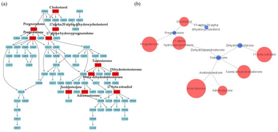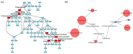 Metabolites with differences between female groups in steroid metabolic pathway. (a) Metabolites in red indicate significant differences between groups and (b) the pathway mapping of metabolites and relative quantitation between female pattern baldness patients and female controls. The larger the circle, the larger the relative quantitative value. Red circles indicate higher metabolite concentration in the patient group and blue circles indicate higher metabolite concentration in the control group.
