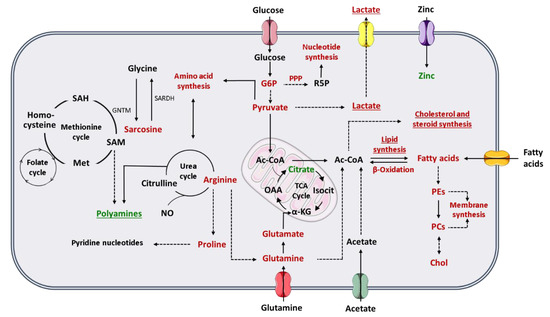 Alterations in different amino acids, such as glutamine, have been associated with PCa and other cancers [50,52]. Glutamine is one of the most abundant amino acids in human plasma and has important roles in human metabolism [54], as it can be converted in glutamate, and subsequently be transformed in α-ketoglutarate, an intermediate in TCA cycle [50,52]. This amino acid can also be used by cancer cells for acetyl-CoA production [54], for fatty acid synthesis [52] and as a nitrogen and carbon donor for nucleotide, lipids and protein synthesis [50,54]. The glutamate resulting from glutamine is an essential substrate for glutathione synthesis, and therefore important for the protection of the cells against oxidative damage [50] (Figure 1). Arginine is an important amino acid involved in PCa metabolism. Arginine is converted by PCa cells in glutamine and/or proline [52]. The increase in proline levels is needed to the maintenance of the levels of pyridine nucleotides [54]. Arginine has also an important role in nitric oxide (NO) production [52] (Figure 1).