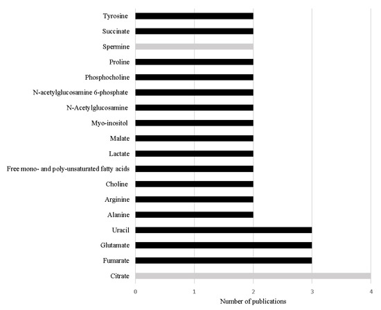 Metabolites referred with the same variation in more than one study performed in PCa tissue in the last 5 years. The black bars represent metabolites increased in PCa and the grey bars represent metabolites decreased in PCa.
