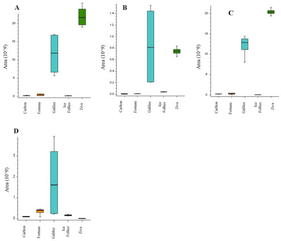 The distribution of the compounds lycorine (A), latifaliumin A (B), lycorinine (C) and tazettine (D) detected mainly in the Galilee and Ziva cultivars presented as box plots. The figures present the mean area values obtained from four extracts for each cultivar (n = 4), where the limit of the lower and upper quartile and minimum and maximum of the distribution are presented as error bars.