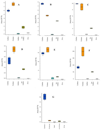The distribution of the compounds carinatine (A), norgalantamine (B), galantamine (C), lycoramine (D), galanthine (E), narweden (F) and narcissidine (G), detected mainly in the Carlton and Fortune cultivars presented as box plots. The figures present the mean area values obtained from four extracts for each cultivar (n = 4), where the limit of the lower and upper quartile and the minimum and maximum of the distribution are presented as error bars.