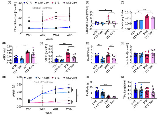 Carnitine induced changes in diabetes. Animal characteristics five weeks post streptozotocin-induced diabetes (STZ) or in citrate buffer injected controls (CTR), 50% of all animals were treated with L-carnitine (Carn) initiated at week 2. (A) Fasted blood glucose concentration at 1, 2, 4 and 5 weeks, **** between CTR and STZ groups at 1, 2, 4 and 5 weeks. (B) Delta blood glucose concentrations between week two and week five. (C) Kidney hypertrophy index assessed as kidney weight/body weight. (D) Non-esterified fatty acids (NEFA). (E) ß-hydroxybutyrate (3-OHB). (F) Triglycerides (TAG). (G) Lactic acid concentration. (H) Body weight measured at 1, 2, 4 and 5 weeks (Wk) post induction of diabetes. (I) Epididymal fat pads. (J) Tibia length. Data are presented as mean ± SD. Two-way ANOVA, if an interaction was found to be significant, the effect of L-carnitine on control and diabetes was evaluated using Sidak’s multiple comparison test. Significant differences are represented by ‘*’, with * p < 0.05, ** p < 0.01, *** p < 0.001, **** p < 0.0001.
