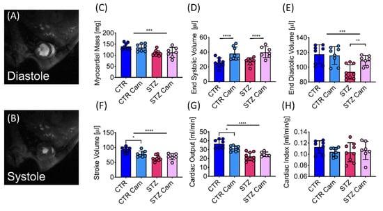 The diabetic heart displays reduced cardiac function on CINE magnetic resonance imaging (MRI). (A) Example CINE-MRI image of the rat heart in diastole. (B) Example CINE-MRI image of the rat heart at systole. (C) Average myocardial wall mass. (D) End-systolic volume (ESV). (E) End-diastolic volume (EDV). (F) Stroke volume (SV). (G) Cardiac output (CO). (H) Cardiac index. Data are presented as mean ± SD. Two-way ANOVA, if an interaction was found to be significant, the effect of L-carnitine on control and diabetes was evaluated using Sidak’s multiple comparison test. Significant differences are represented by ‘*’, with * p < 0.05, ** p < 0.01, *** p < 0.001, **** p < 0.0001.