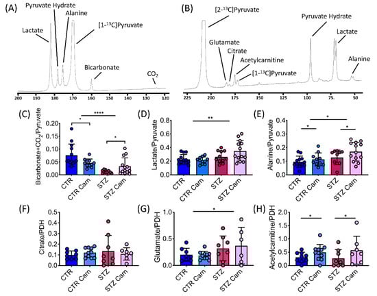 Carnitine can modulate in vivo cardiac metabolism. In vivo effects on cardiac metabolism by infusion of hyperpolarized [1-13C]pyruvate and [2-13C]pyruvate. (A) Example [1-13C]pyruvate spectrum acquired from the in vivo rat heart. (B) Example [2-13C]pyruvate spectrum acquired from the in vivo rat heart. (C) Bicarbonate + CO2/pyruvate ratio, as a measure of pyruvate dehydrogenase (PDH) flux. (D) Lactate/pyruvate ratio. (E) Alanine/pyruvate ratio. (F) Citrate/pyruvate ratio normalized to PDH flux. (G) Glutamate/pyruvate ratio normalized to PDH-flux. (H) Acetylcarnitine/pyruvate ratio normalized to PDH-flux. Data are presented as mean ± SD. Two-way ANOVA, if an interaction was found to be significant, the effect of L-carnitine on control and diabetes was evaluated using Sidak’s multiple comparison test. Significant differences are represented by ‘*’, with * p < 0.05, ** p < 0.01, **** p < 0.0001.