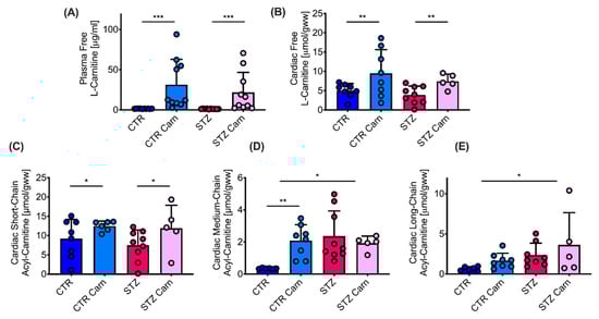 L-carnitine treatment elevated both plasma and cardiac free L-carnitine levels, as well as short-chain acyl-carnitine levels in the cardiac tissue of control and STZ animals (Figure 4A–C). Analysis of the individual short-chain carnitine species, showed this elevation to be driven by significant increases in the C3, C4, C5, C6 and C8 species (Table 2). L-carnitine treatment led to a significant increase in the medium-chain acyl-carnitines in the control animals but had no effect on the long-chain acyl-carnitines in either the STZ or control animals (Figure 4D,E).