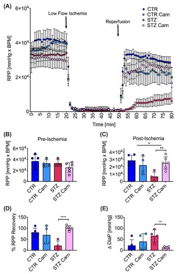 Carnitine rescues cardiac function in diabetes after low-flow ischemia in Langendorff perfused hearts. (A) Rate pressure product (RRP) over time: pre-ischemia (t = 1:20 min), low flow ischemia (t = 21:50 min), post ischemia (t = 51:80 min). (B) Rate pressure product (RRP) pre-ischemia. (C) Rate pressure product (RRP) post-ischemia. (D) Percentage recovery between pre-ischemia (t = 10:20 min) and post-ischemia (t = 70:80 min). (E) Difference between post-ischemia and pre-ischemic diastolic pressure (∆DiaP). Diastolic pressure was set during pre-ischemia to 4–8 mmHg. Data are presented as mean ± SD. Two-way ANOVA, if an interaction was found to be significant, the effect of L-carnitine on control and diabetes was evaluated using Sidak’s multiple comparison test. Significant differences are represented by ‘*’, with * p < 0.05, ** p < 0.01, **** p < 0.0001.