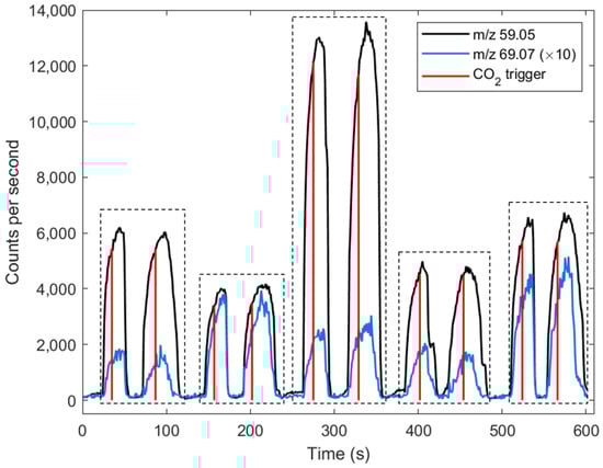 Raw signals of m/z 59.05 (acetone) and m/z 69.07 (isoprene) from five consecutive participants duplicate breath samples (each participant is separated using the dashed boxes). The red line represents the trigger that was activated when the CO2 concentration in exhaled breath reached 4%. On average, two minutes per participant are sufficient to collect the samples.