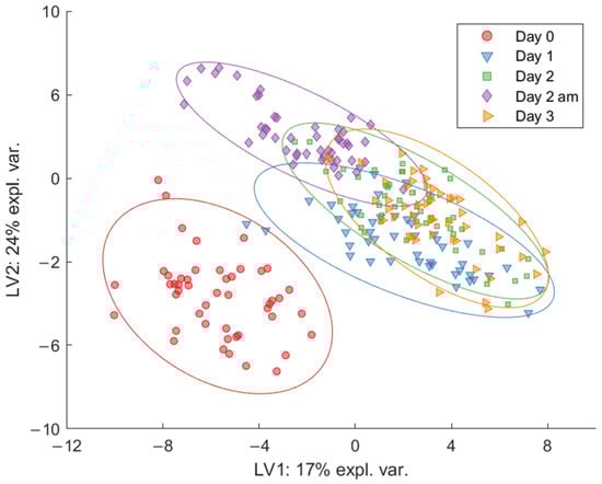 Multilevel partial least squares discriminant analysis (M-PLS-DA) model for the effect of walking on the breath volatile organic compound (VOC) profile for St0. The model includes all sample time points. A clear separation between Day 0 and the remaining time points (Day 1–Day 3) is revealed, indicating a significant change in the breath profile at the onset of exercise compared against Day 0.