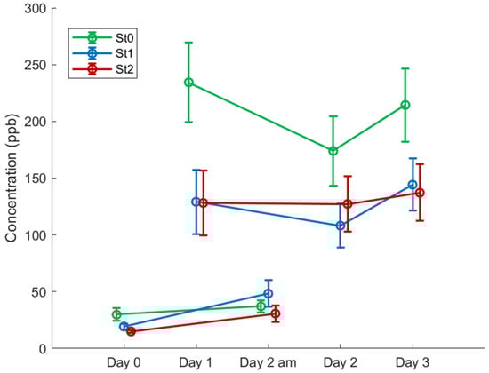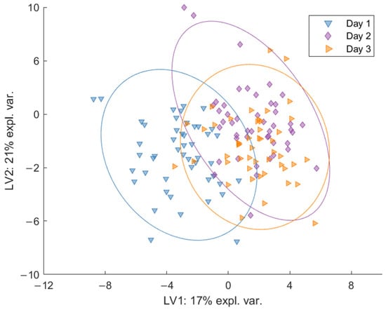 The differences between the post-walking measurements were explored by additional local M-PLS-DA models considering only data from Day 1, Day 2, and Day 3 for each group separately. The trend observed for each group was similar (Figure 3 for St0 and Figure S5 for St1 and St2, respectively). Separation was observed between the breath profiles on Day 1 and Day 2 and Day 3 along the first latent variable (LV1). The breath profiles for Day 2 and Day 3 overlap, suggesting that Day 2 and Day 3 have similar breath profiles. This result suggests an acute response to the first day of walking followed by a progression toward a steady state, as the participants somewhat adapt to the prolonged and repeated exercise.