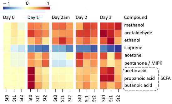 Relative change in the median concentrations of the significant VOCs in relation to the effect of exercise during the 4 days. The concentrations are relative to baseline measurements of before walking of non-statin users (St0) and range scaled by row. All the VOCs, including the short-chain fatty acids (SCFA), reflect a recovery type effect for all participants, by increasing following Day 1 of exercise and then subsequently decreasing after a rest period (Day 2 am), and increasing again after exercise (Day 2, Day 3). Isoprene is an exception, and it shows the opposite trend, i.e., decreasing in relation to exercise.