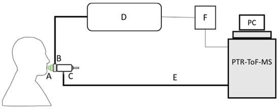 Schematic diagram of the breath sampling setup. Participants exhaled through a bacterial mouth filter (A) connected to a CO2 sensor (B) into a heated buffer pipe (C) at a constant flow of 50 ml/sec following a visual indicator on the screen of the breath sampler (D) for as long as was comfortable. The pipe is connected to the proton transfer reaction time-of-flight mass spectrometry (PTR-ToF-MS) via a heated sampling line (E). When the CO2 concentration reached 4%, a CO2-flow monitoring trigger signal (F) was sent to the PTR-ToF-MS to aid with data processing.