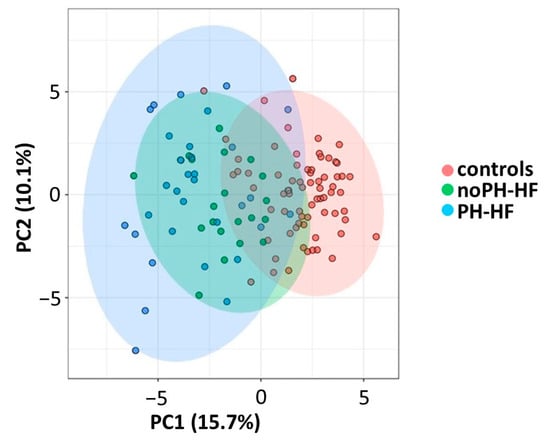 Population characteristics and laboratory parameters were presented according to control, noPH-HF, and PH-HF groups. Continuous variables were presented as means ± standard deviation or medians and interquartile range according to distribution normality. Categorical variables were presented as frequencies and percentages. Groups were compared using analysis of variance, Kruskal Wallis, Chi-squared, or Fisher’s exact tests where appropriate (Graph Pad Prism 8.3.1 software). Principal component analysis (PCA) was performed on normalized metabolite concentrations for the 55 metabolites and 124 samples remaining post-quality control, to visually assess how the different populations were discriminated using the prcomp function and the ggbiplot package in R (version 3.4.4, https://github.com/vqv/ggbiplot, accessed on 23 March 2021). To identify metabolites with the ability to discriminate subjects among groups, loadings of PC1 and PC2 were used to select metabolites with the highest PC and their mean plasma concentration or ratio was compared among groups using analysis of variance (ANOVA). They were then compared using stepwise analysis of covariance (ANCOVA) multivariable models considering preselected variables known to affect circulating levels of lipid metabolites [34,35]. The first model (ANCOVA 1) included age, sex, estimated glomerular filtration rate (eGFR) and homeostatic model assessment of insulin resistance (HOMA-IR) as covariates. The second model (ANCOVA 2) included the same covariates in addition to NT-proBNP, used as a surrogate for HF severity. The interaction between patient group and NT-proBNP was tested to explore the effect of patient group on the association between NT-proBNP and metabolites. Interaction analyses were also tested with diuretics, statins, and diabetic status. Metabolites with significant interaction effects were further investigated with Pearson correlation tests for their association with NT-proBNP in each patient group. Normality and linearity were verified, and logarithmic transformation was applied where indicated. Two-tailed p-values < 0.05 were considered statistically significant and there was no correction or adjustment for multiple testing made. Data analyses were performed using SAS software (version 9.4, SAS Institute, Cary, NC, USA).