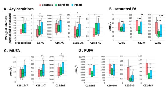 Acylcarnitines and fatty acids circulating levels are differentially affected in PH-HF (n = 33) and noPH-HF (N = 27) compared to controls (N = 72). Box plots represent top discriminant FA-related metabolites identified using the PCA analysis in the comparison noPH-HF (green) vs. controls (red) and PH-HF (blue) vs. controls. Shown are semi-quantitative analyses of (A) acylcarnitines reported as MS signal ratio normalized to standard, and the quantitative analysis of (B) saturated FA, (C) MUFA, and (D) PUFA. In the boxplots, rectangles represent the SD, the segment inside the rectangle the median and the whiskers above and below the maximum and minimum. * p < 0.05, ** p < 0.01, *** p < 0.001 compared to controls; $ p < 0.05, $$ p < 0.01 PH-HF vs. noPH-HF. Other more commonly measured metabolites are shown in Figure S1.