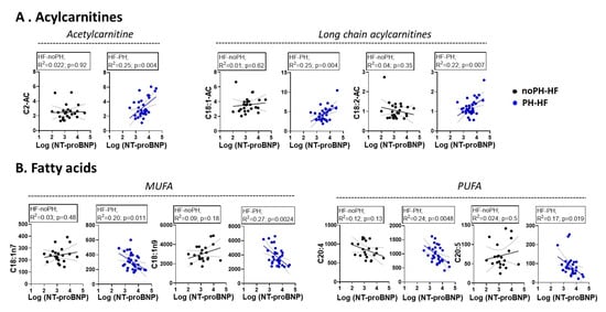 Correlation analyses were conducted to explore the relationship between disease severity (plasma NT-proBNP) and metabolites for which a significant interaction was found. Scatter plots for noPH-HF (black) and PH-HF (blue) are depicted in Figure 3. Similar to the interaction analyses, we observed no significant correlation between NT-proBNP and acylcarnitines or FA in noPH-HF patients. In contrast, there was a positive correlation between NT-proBNP and acylcarnitines in the PH-HF group, with C2-AC (R2 = 0.25, p = 0.004), C18:1AC (R2 = 0.25, p = 0.004), and C18:2AC (R2 = 0.22, p = 0.007). Regarding FA, negative correlations were observed in MUFA and PUFA as highlighted with C18:1n7 (R2 = 0.20, p = 0.011), C18:1n9 (R2 = 0.27, p = 0.024), C20:4 (R2 = 0.24, p = 0.0048), and C20:5 (R2 = 0.17, p = 0.019).