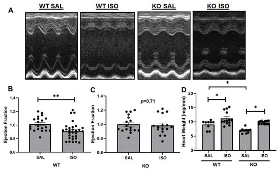 WT mice exposed to two weeks of treatment of isoproterenol resulted in a significant decrease in the ejection fraction (EF%) compared with saline-infused WT mice (Figure 1A,B). Kvβ2 KO mice demonstrated no significant decreases in EF% after two weeks of treatment of isoproterenol compared with saline-infused KO mice (Figure 1A,C). In line with our previously published data, Kvβ2 KO mice presented with smaller hearts, as evident by the significant decrease in heart weight (Figure 1D). Heart weights in both the Kvβ2 KO mice and wildtype mice demonstrated a significant increase in heart weight after isoproterenol exposure with a clear hypertrophic response (Figure 1D).