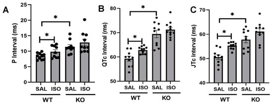 In confirmation with our previously published work [8], Kvβ2 KO mice aged 14–16 weeks old demonstrated significantly prolonged P intervals (Figure 2A) compared with the wildtype controls. Isoproterenol exposure did not demonstrate a significant effect on the P interval either in wildtype or Kvβ2 KO mice. The QTc intervals demonstrated significant prolongation compared with the WT control (saline) mice (Figure 2B). The JTc (corrected JT) interval was also calculated as a measure of the ventricular repolarization, demonstrating significant prolongation compared with WT control (saline) mice (Figure 2C). Two weeks of treatment of isoproterenol resulted in a significant prolongation in the QTc and JTc intervals in WT mice (Figure 2B,C). Interestingly, two weeks of treatment of isoproterenol in KO mice demonstrated no further prolongation in the QTc or JTc intervals.