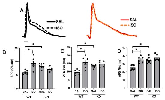The monophasic action potential (MAP) recordings demonstrated a significant prolongation in the action potential durations (APDs) in Kvβ2 KO mice compared with the WT controls (saline) (Figure 3A–D). The wildtype hearts that were exposed to two weeks of treatment of isoproterenol resulted in a significant prolongation in the APD values, including 20%, 50%, and 70% repolarization (Figure 3B–D). The Kvβ2 KO hearts, however, demonstrated no further prolongation in the APD values at 20–70% repolarization compared with Kvβ2 KO (saline).