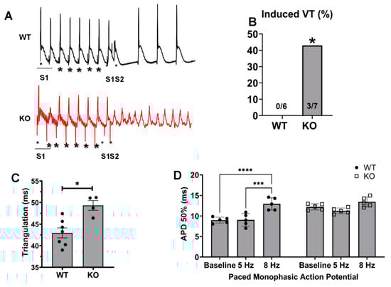 Kvβ2 deletion increases the susceptibility to ventricular arrhythmias. (A,B) Programmed electrical stimulation in wildtype (WT) and Kvβ2 knockout (KO) mice. Onset of ventricular tachycardia (VT) after premature stimulus (small asterisk) is shown in Kvβ2 KO mice (none of the six wildtype mice were inducible, but three of the seven KO mice were inducible: * p < 0.05). (C). LV surface MAP triangulation at the baseline measurements. (D) LV surface MAPs at 50% repolarization (APD 50%) during paced stimulations at 5 Hz and 8 Hz. Scale bar represents 100 ms. The data represented are the mean ± SEM. * represents p < 0.05, *** represents p < 0.01, and **** represents p < 0.001.