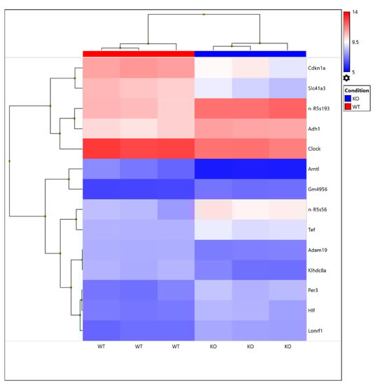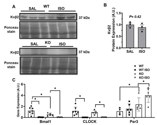 The transcriptome analysis of cardiac samples from WT and KO mice demonstrated significant alterations in 156 gene expressions (Figure 5), allowing the identification of 138 upregulated genes and 18 downregulated genes that were utilized for further analysis. The top genes altered are presented in Figure 5, based on the statistical analysis using a cutoff of 1.5-fold or higher and p<0.05 for comparing WT vs KO. The transcriptome analysis identified a novel solute carrier transport protein SLC41a3 as a likely downregulated gene that was modulated in the Kvβ2 KO mouse hearts. In addition, the transcriptome analysis revealed significant alterations in the peripheral cardiac circadian core clock genes (Figure 5). The examination of the Kvβ2 expression in the presence of isoproterenol-induced injury resulted in no significant expression changes (Figure 6A,B). We, therefore, confirmed the key transcriptome targets with qPCR analysis and identified that Arntl (Bmal1; Brain and Muscle ARNT-Like 1) and Clock (Circadian Locomotor Output Cycles Kaput) were downregulated in Kvβ2 KO hearts, while Per3 (Period Circadian Regulator 3) was significantly upregulated (Figure 6C). A further examination investigating isoproterenol’s role resulted in a significant decrease in Arntl/Baml1 and Clock gene expressions in both WT and Kvβ2 KO hearts, while isoproterenol’s effect resulted in a marked increase in the Per3 expression levels (Figure 6C). Overall, the microarray and qPCR validation identified the gene responses that were altered due to Kvβ2 KO and were further modulated due to isoproterenol exposure.